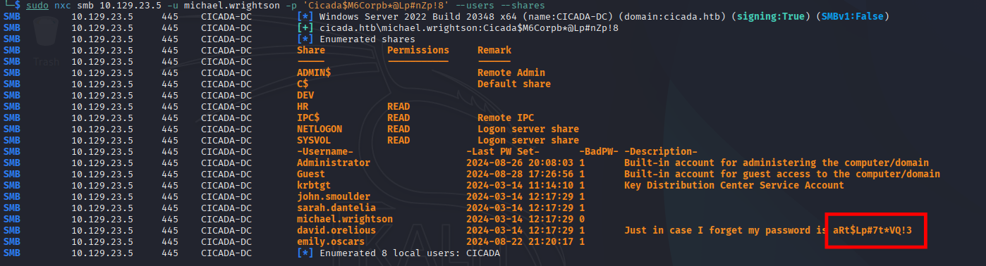 cicada.htb\david.orelious:aes256-cts-hmac-sha1-96:125726466d0431ed1441caafe8c0ed9ec0d10b0dbaf4fec7a184b764d8a36323