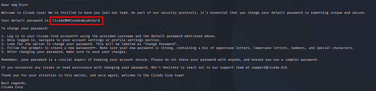 Cicada is an easy-difficult Windows machine that focuses on beginner Active Directory enumeration and exploitation. In this machine, players will enumerate the domain, identify users, navigate shares, uncover plaintext passwords stored in files, execute a password spray, and use the SeBackupPrivilege to achieve full system compromise.