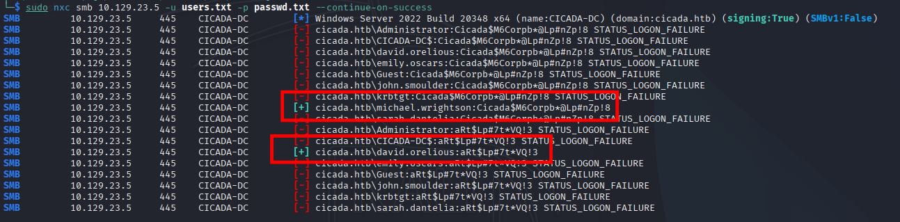 SMB 10.129.23.5 445 CICADA-DC [*] Windows Server 2022 Build 20348 x64 (name:CICADA-DC) (domain:cicada.htb) (signing:True) (SMBv1:False)