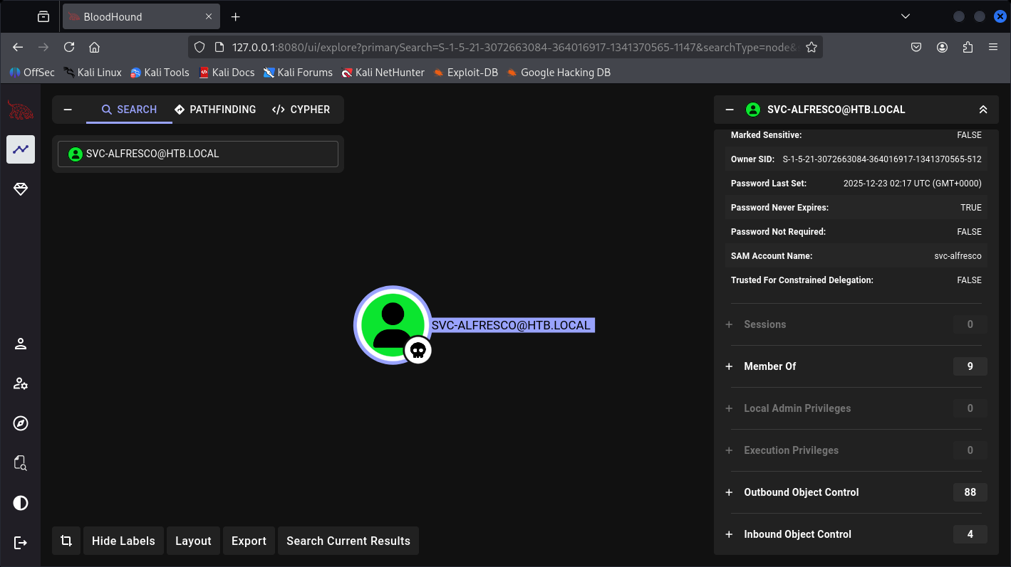 htb.local\svc-alfresco:aes256-cts-hmac-sha1-96:46c50e6cc9376c2c1738d342ed813a7ffc4f42817e2e37d7b5bd426726782f32
