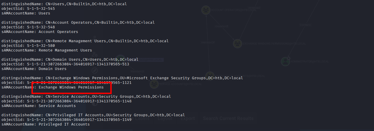 The service account is found to be a member of the Account Operators group, which can be used to add users to privileged Exchange groups. The Exchange group membership is leveraged to gain DCSync privileges on the domain and dump the NTLM hashes, compromising the system.