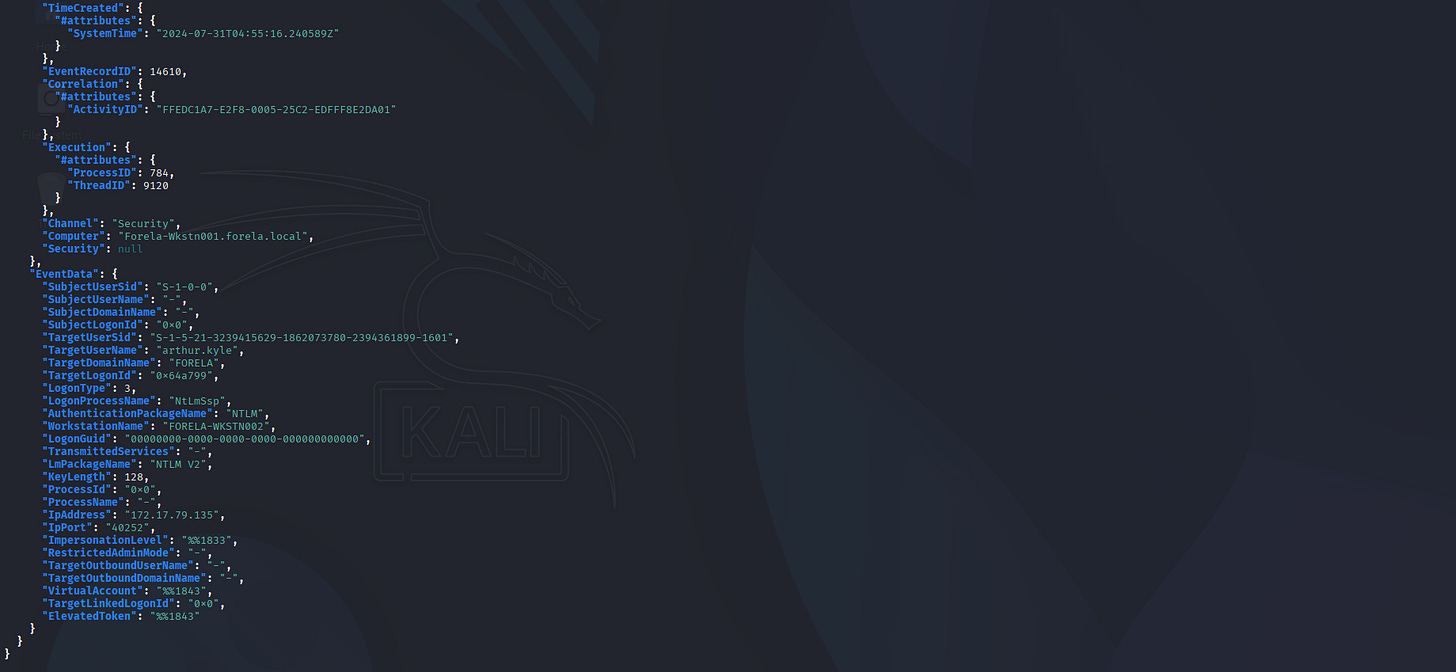 This is the authentication attempt at WKSTN001 from WKSTN002 but from the attacker’s IP as arthur.kyle.