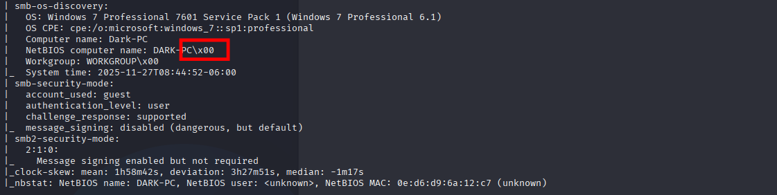 SMB 10.65.190.242 445 DARK-PC [*] Windows 7 / Server 2008 R2 Build 7601 x64 (name:DARK-PC) (domain:Dark-PC) (signing:False) (SMBv1:True)