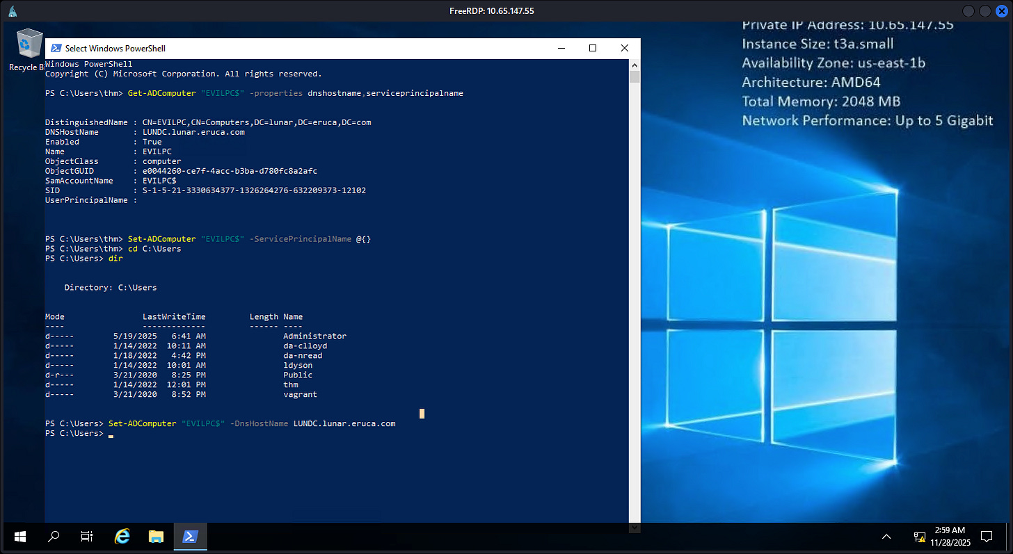 PS C:\Users\thm> Set-ADComputer EVILPC -DnsHostName LUNDC.lunar.eruca.com